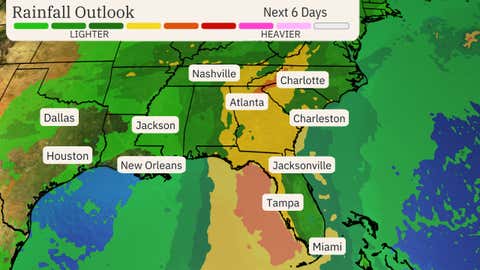 The heaviest rain is expected Thursday into Friday in parts of the Southeast, but some bands of heavy rain could arrive as early as Wednesday. This rain could lead to flash flooding, especially where it combines with storm surge and over higher terrain.